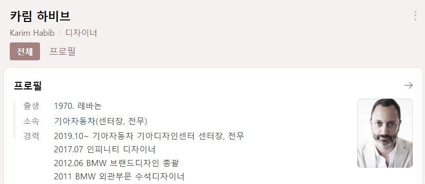 영화 레옹의 남자 주인공을 연상시키는 외모를 가진 카림 하비브는 2019년 부터에 기아로 영입되었는데 BMW 디자인 총괄, 인티니티를 거쳐서 현재는 기아자동차 디자인 센터장을 담당하고 있습니다.