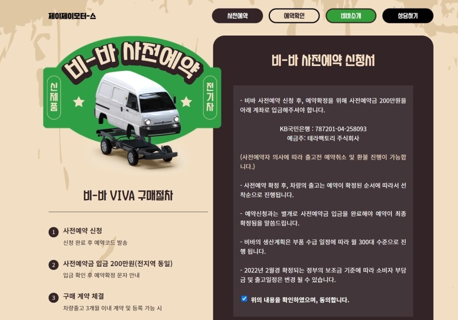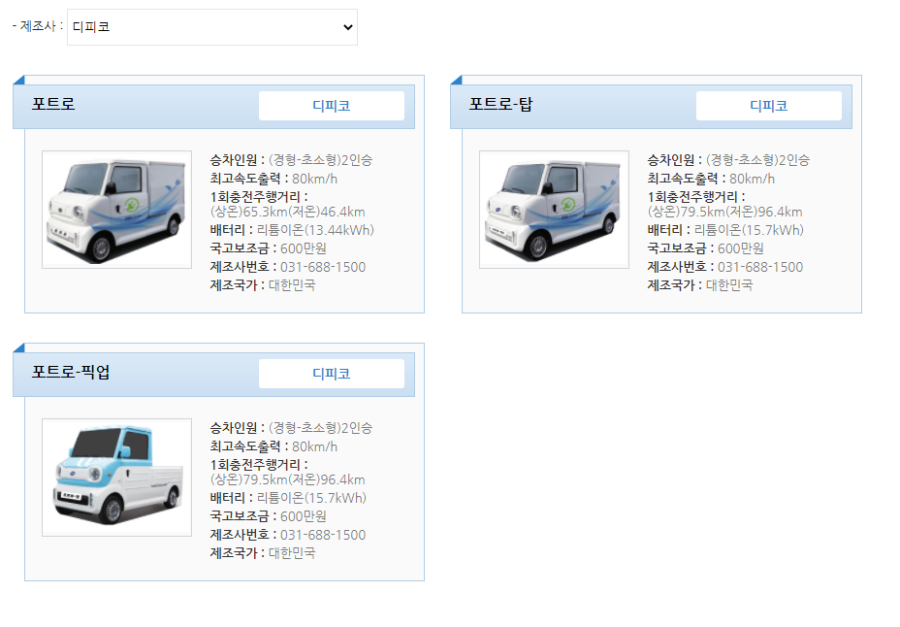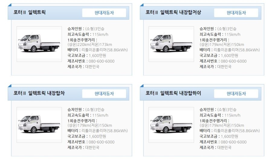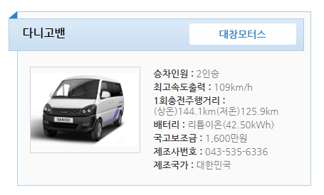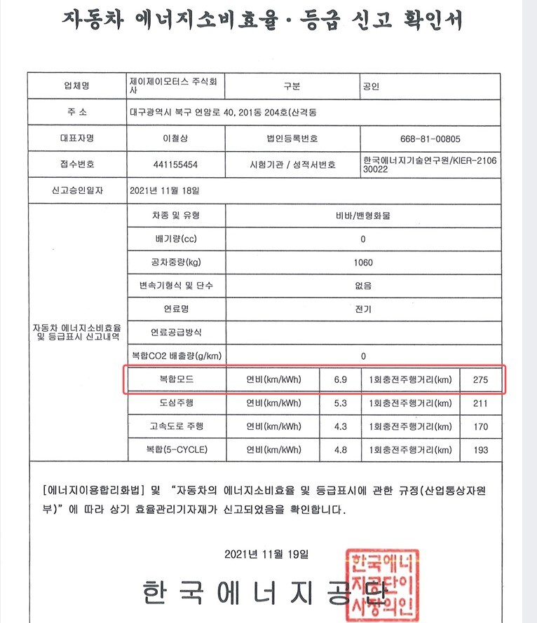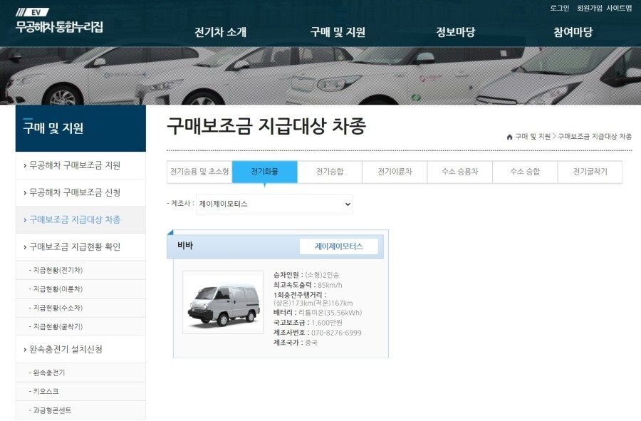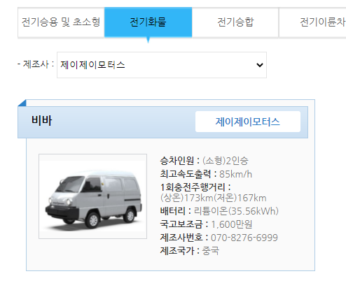 환경부에서 운영하는 무공해차 통합누리집에서 전기화물 > 제이제이모터스로 찾아보면 인증받은 내용을 확인할 수 있습니다.