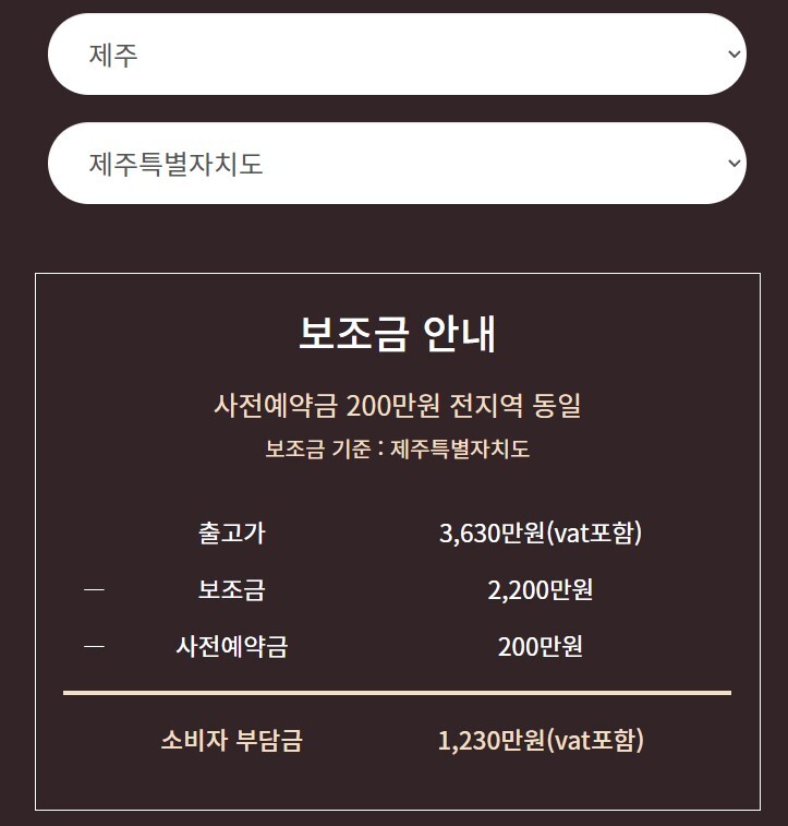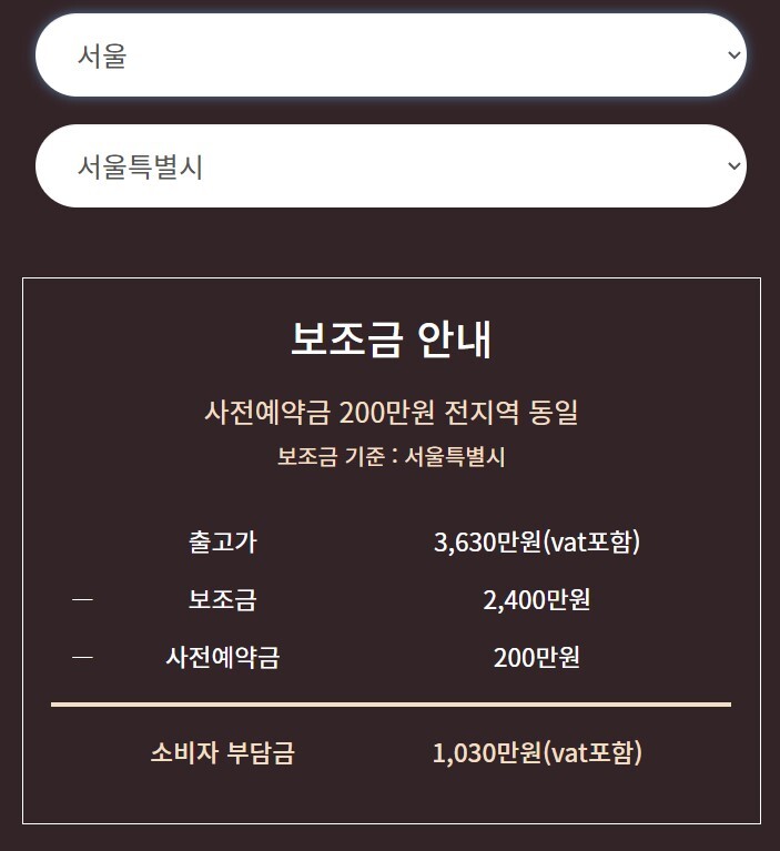 서울로 조회하면 보조금은 총 2400만 원이 지급되며, 사전 예약금 200만 원을 제외하면 서울 지역 소비자가 부담해야 하는 실질가격은 1030만 원이 되네요!