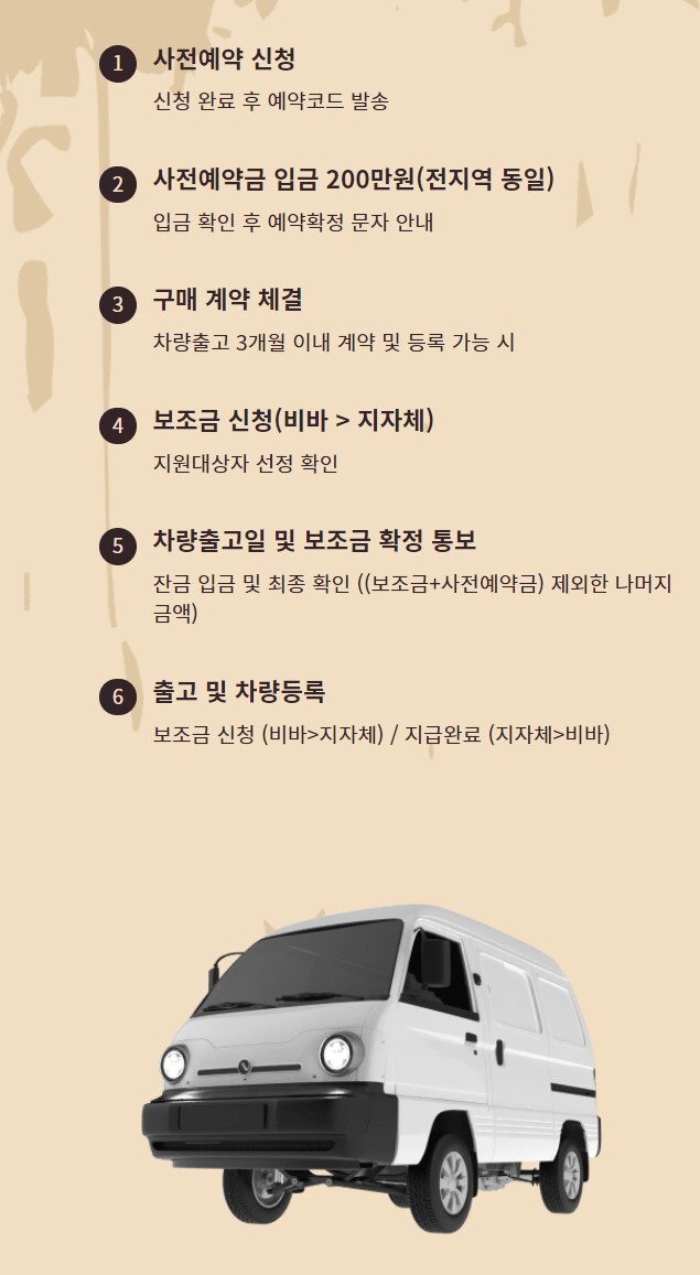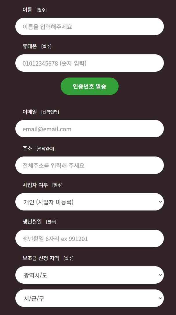 이름 석자와 휴대폰 번호를 입력하고 이메일, 주소, 사업자 여부, 생년월일, 보조금 신청 지역을 조회하면 사전 예약이 완료됩니다.