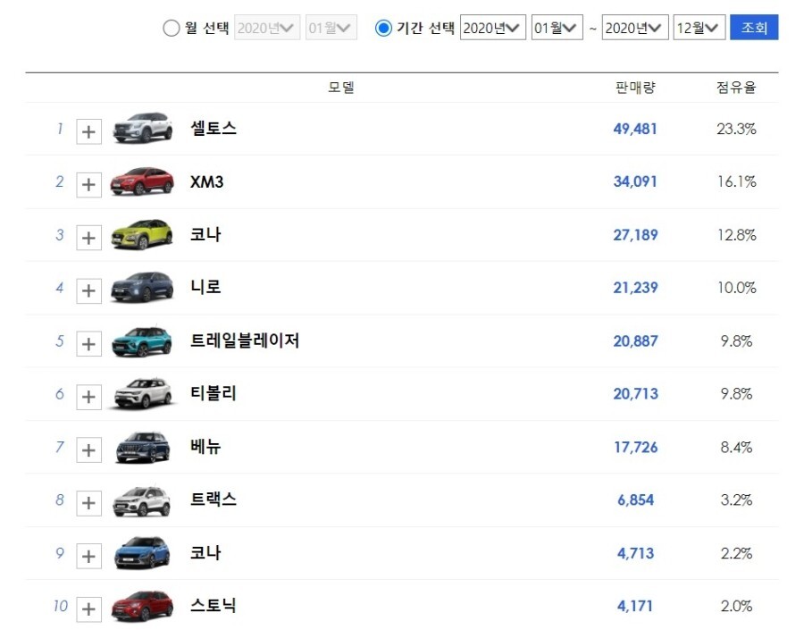 그리고 올해도 소형 SUV 시장에서 부동 1위 자리를 차지하고 있는데 작년보다는 1만대 정도 줄어든 판매량을 기록하게 될 것 같네요.