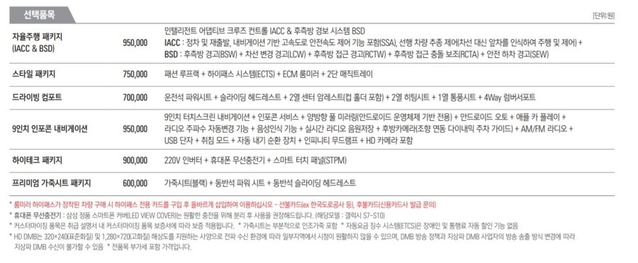 자율주행 패키지 95만원, 스타일 패키지 75만원, 드라이빙 컴포트 70만원 9인치 인포콘 내비게이션 95만원, 하이테크 패키지 90만원, 프리미엄 가죽 시트 패키지 60만원으로 라이프 스타일과 주행 환경에 맞게 선택하시면 좋을 것 같네요.