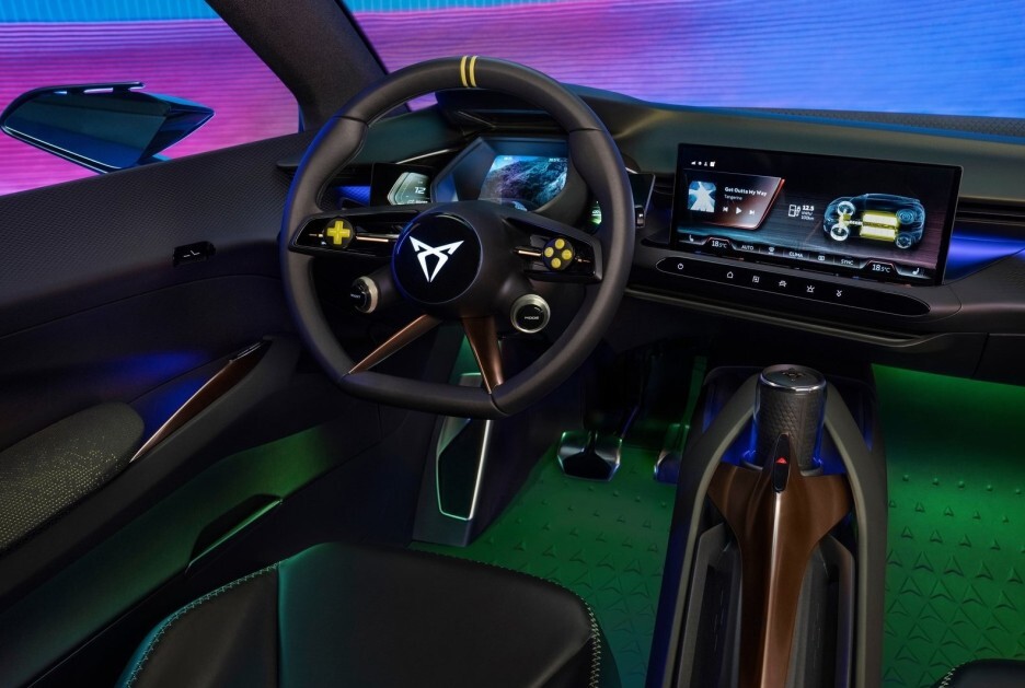 쿠프라의 대표 색상인 구리 색상과 전기차만의 화려한 빛을 적절하게 사용한 실내는