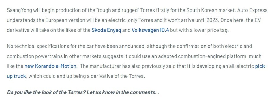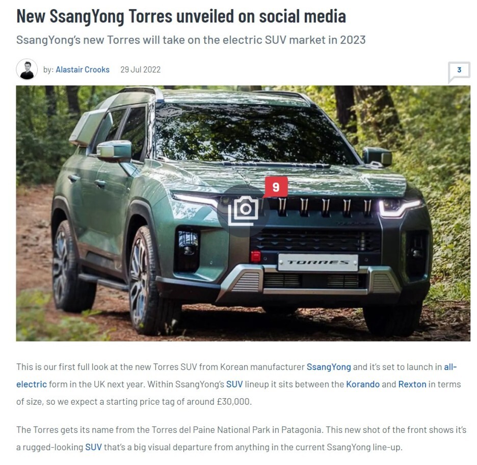 이 기사 하단에는 토레스 전기차 소식과 함께 유럽에 2023년도에 토레스 전기차가 출시되기는 힘들 것 같다는 이야기와 함께