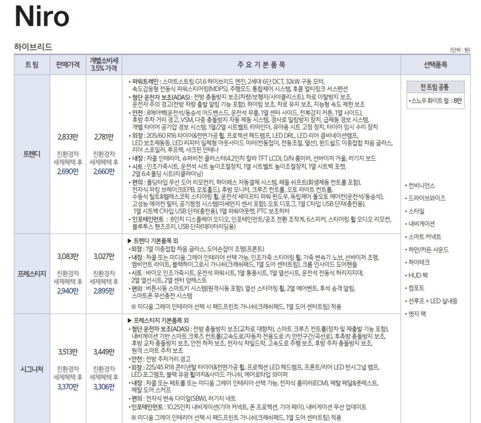 따라서 니로 하이브리드 프리스티지와 시그니처로 비교해 본다면 거의 비슷한 가격대로 예상됩니다.