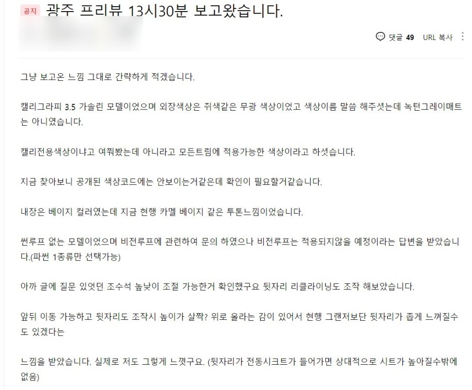 이제 다음주에는 대구와 대전에서 전시가 되는데, 2열 헤드룸을 포함해서 불편사항이 있는지 면밀하게 체크해 보고