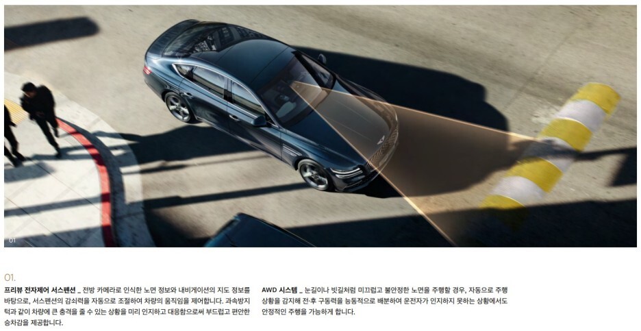 제네시스 브랜드에서 G90을 제외한 다른 차량은 에어서스펜션이 아닌 프리뷰 전자제어 서스펜션이 제공되죠?