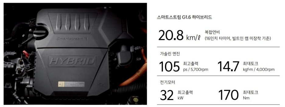 예상되는 파워트레인은 1.6 가솔린 엔진과 전기 모터가 조합된 파워트레인으로 복합 연비는 무려 21.1km/L 입니다.