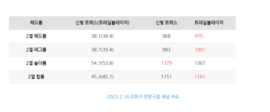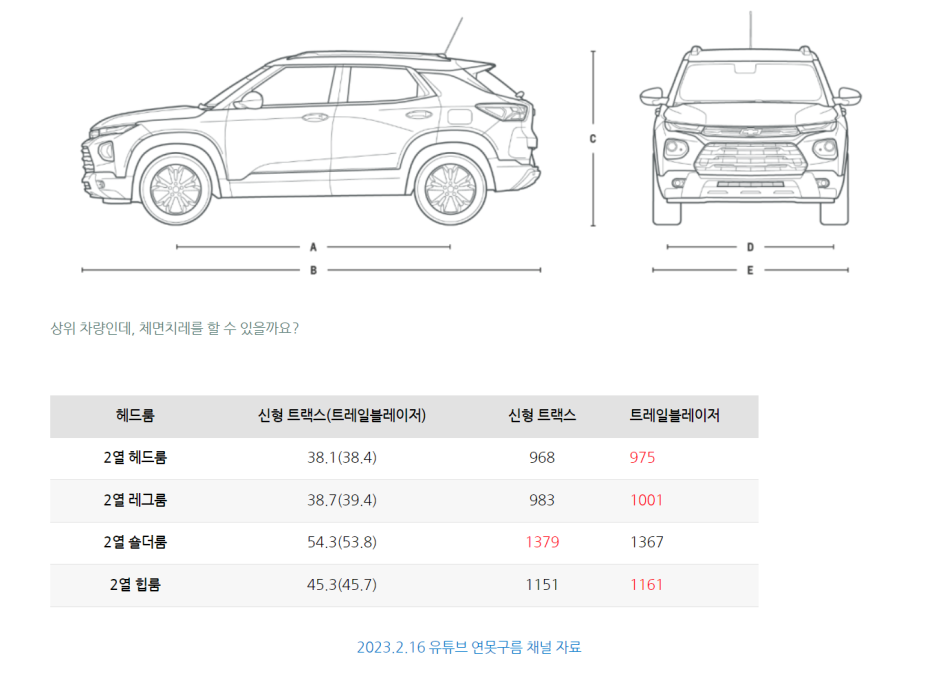 2열 공간은 트레일블레이저가 신형 트랙스보다 어깨 공간인 숄더룸을 제외한 모든 부분에서 좀 더 여유로운 공간을 제공하는 것이 확인되었습니다.