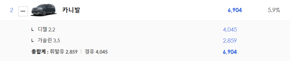 2위 카니발은 디젤 2.2가 압도적으로 많이 판매되고 있습니다.