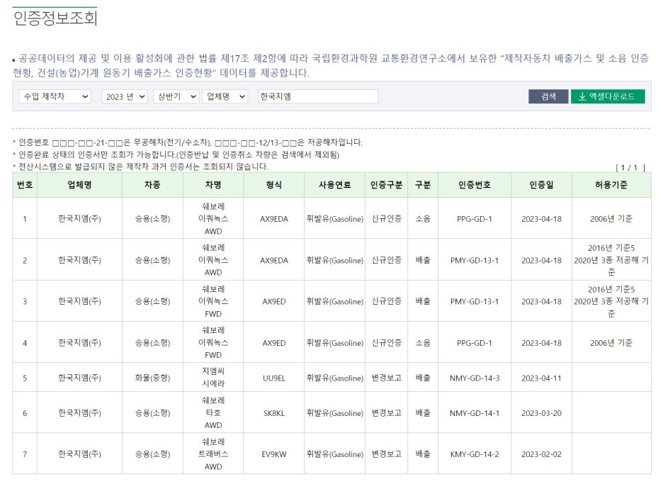 그래서 환경부 공공데이터를 검색해 봤는데, 현재까지 배출가스 및 소음 인증을 완료되지 않았습니다.