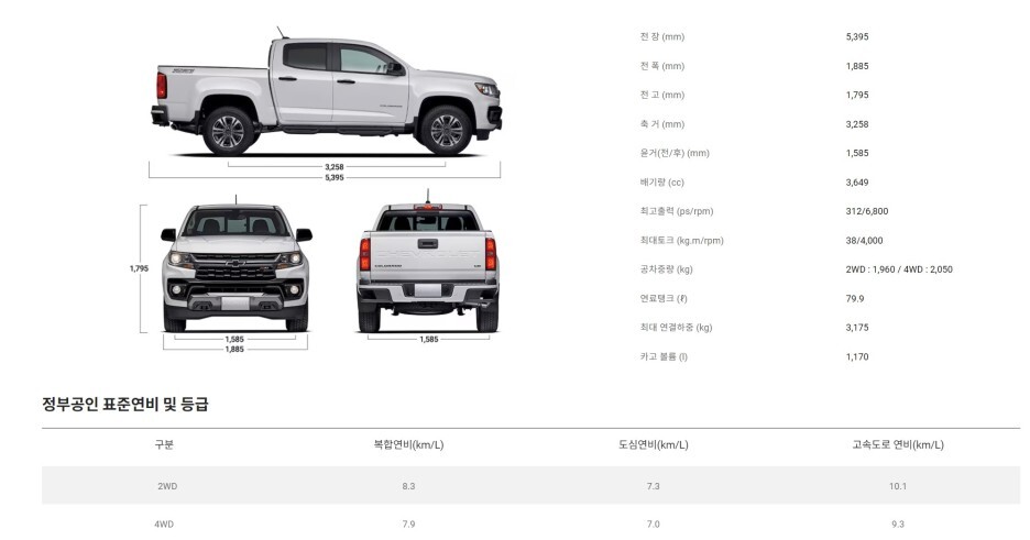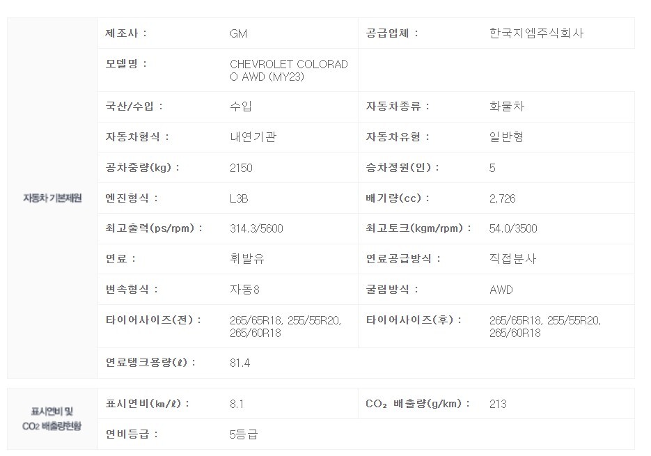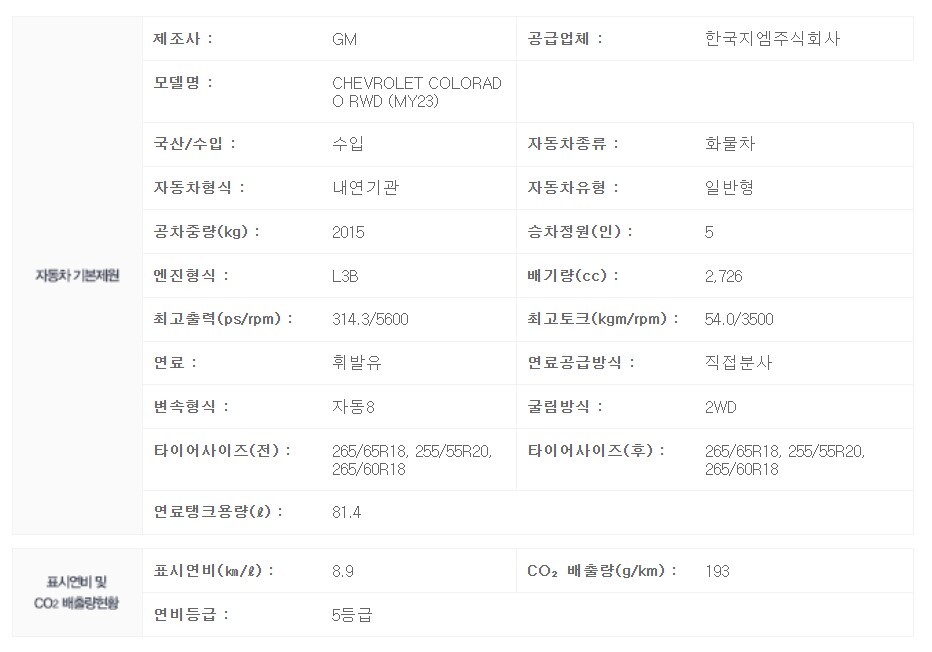 에너지 공단에 업데이트된 인증 내역을 보면 배기량이 2726리터로 이 차량이 신형 콜로라도라는 것을 확인할 수 있습니다.
