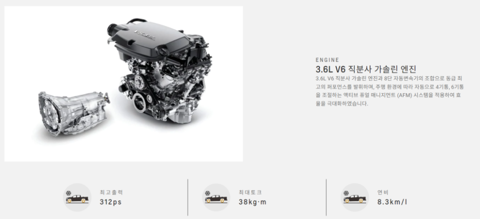 기존 3.6L에서는 312마력을 제공했기 때문에 스펙적으로는 차이가 없네요!