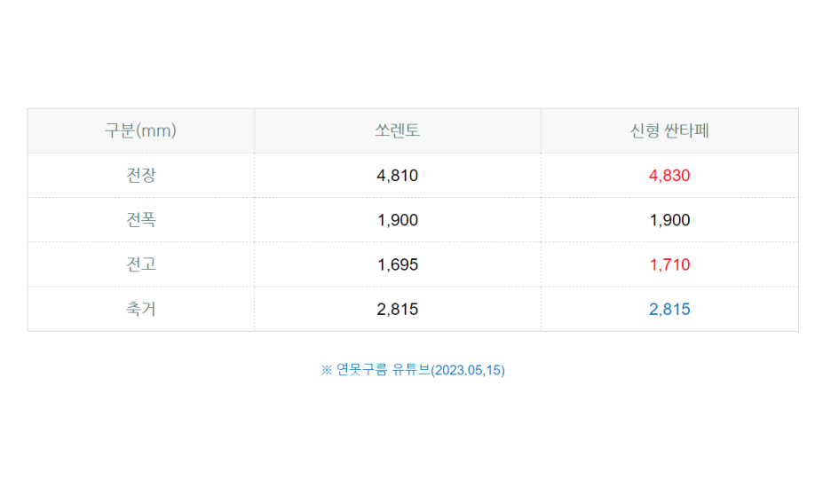 채널에서 알려드린 신형 싼타페의 예상 제원은 쏘렌토와 큰 차이가 없습니다.