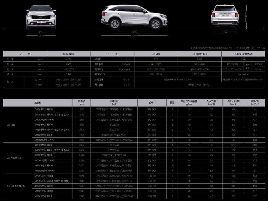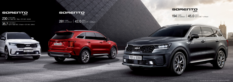 그리고 쏘렌토 역시 디젤 194마력과 281마력을 볼 수 있습니다. 엔진은 완전히 동일하죠?