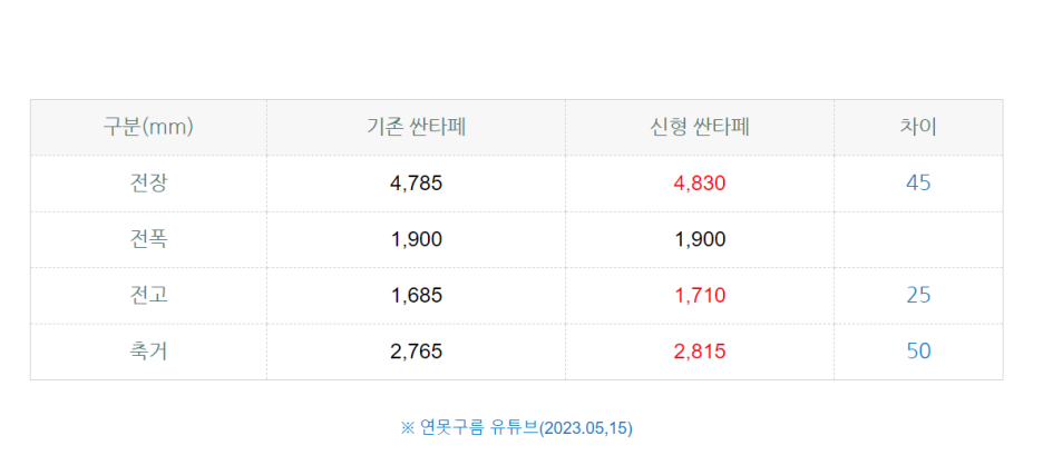 전장이 전고가 조금 다르지만 이건 범퍼 디자인만 달라도 변경되며, 실내 공간에 영향을 미치지 않습니다.