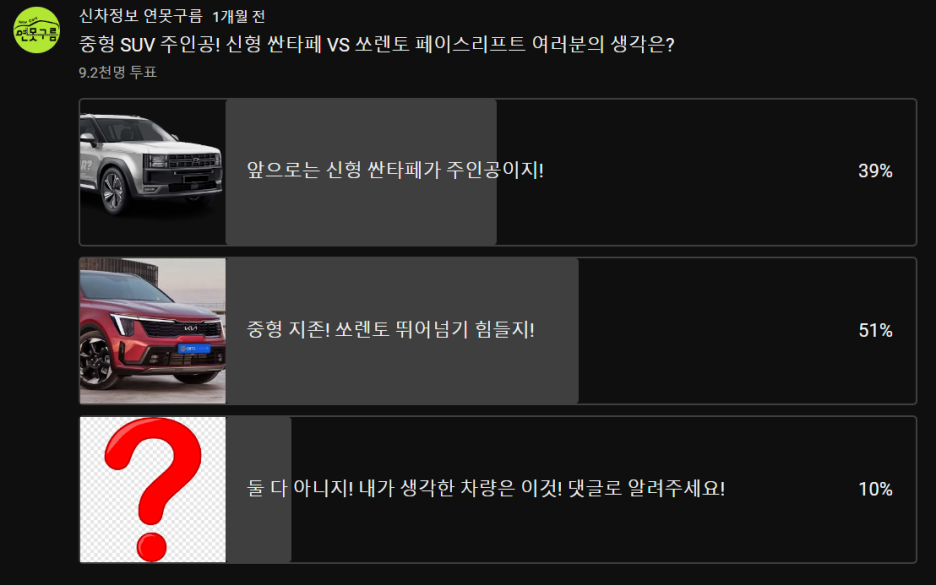 채널의 설문 조사에서는 신형 싼타페 39% 쏘렌토 페이스리프트 51%로 쏘렌토가 앞으로도 신형 싼타페를 뛰어넘는다는 전망이 나왔습니다. 다만 이 설문은 실내 공간과 수납공간을 채널에서 알려드리기 전에 설문이었는데...