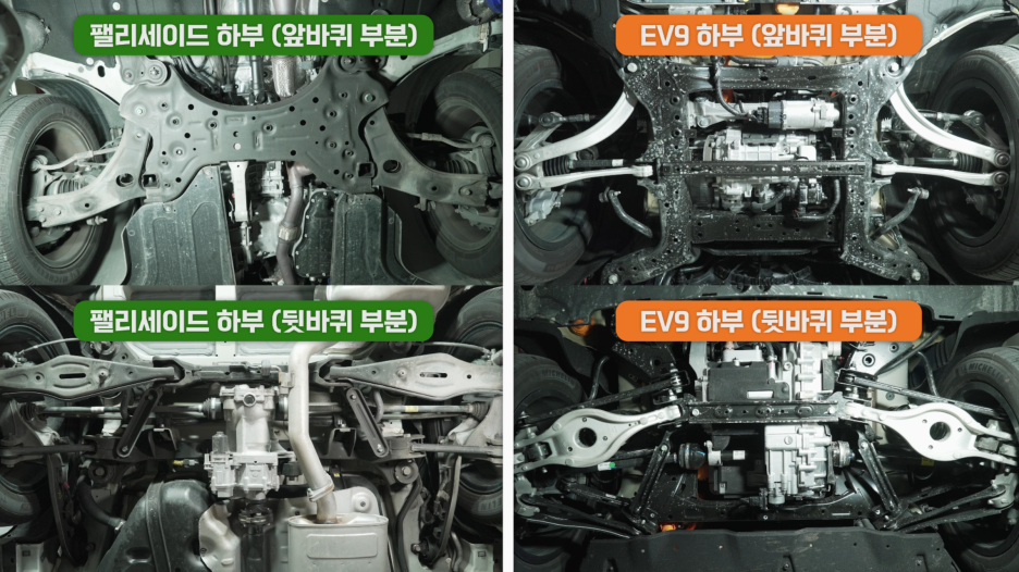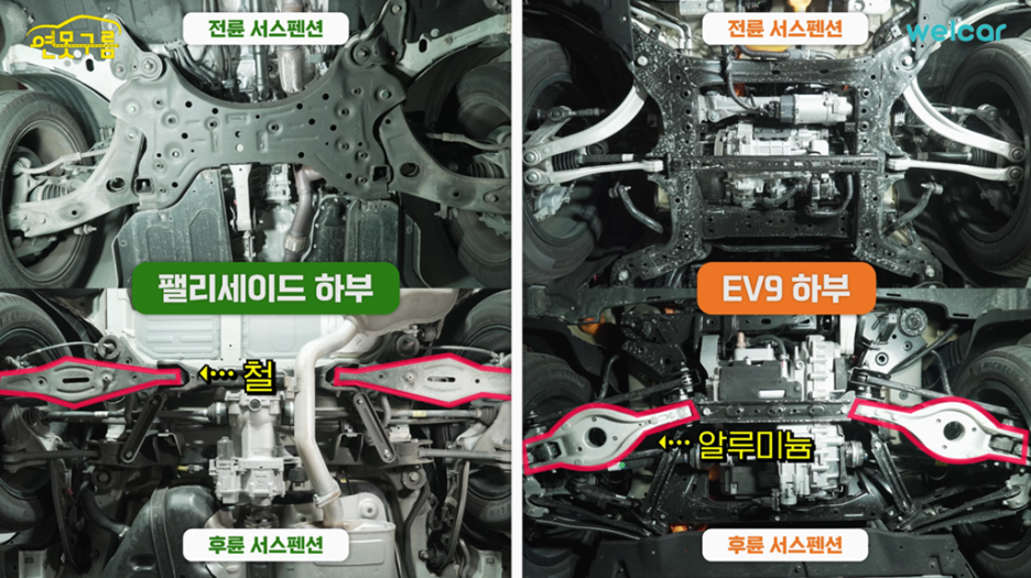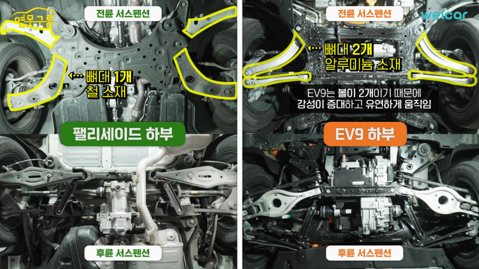 반면 오른쪽 사진은 EV9의 전륜 하부인데, 2개의 로우암으로 구성되어 있습니다.