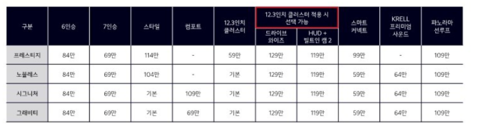 기본 트림 프레스티지는 기존보다 +185만원이 인상되었습니다.