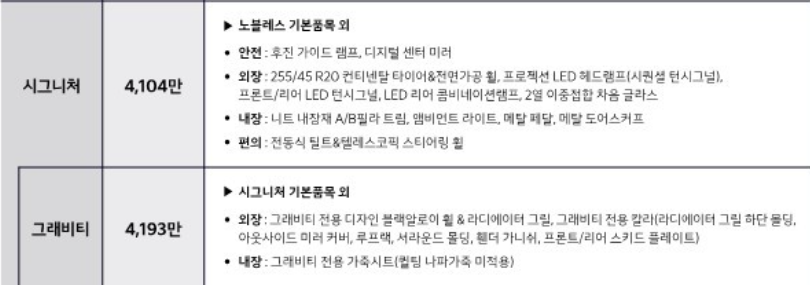 기본 트림 시그니처는 기존보다 +185만원이 인상되었습니다.