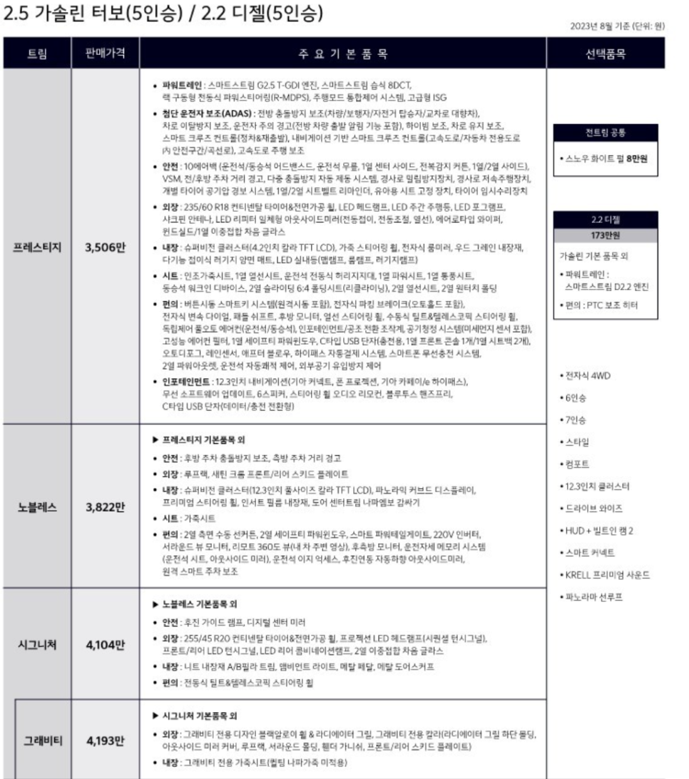 기본 트림 프레스티지는 기존보다 +199만원이 인상되었습니다.