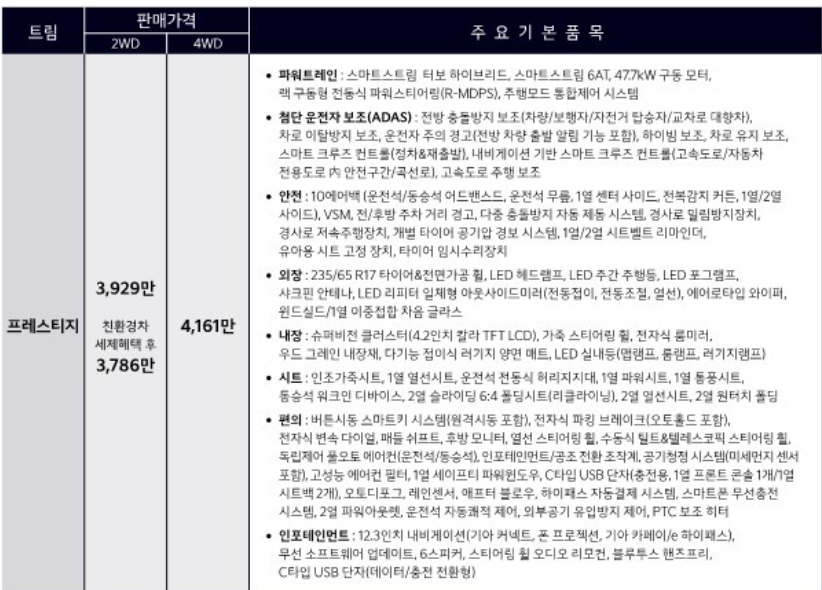 기본트림 프레스티지 3929만원(세재혜택후 3786만원)