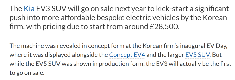 그래서 누구나 내년에 가장 먼저 출시된 전기차가 EV5라고 생각했는데, 기아는 EV3 < EV4 < EV5 순서로 국내에 출시한다고 공식 발표했습니다.