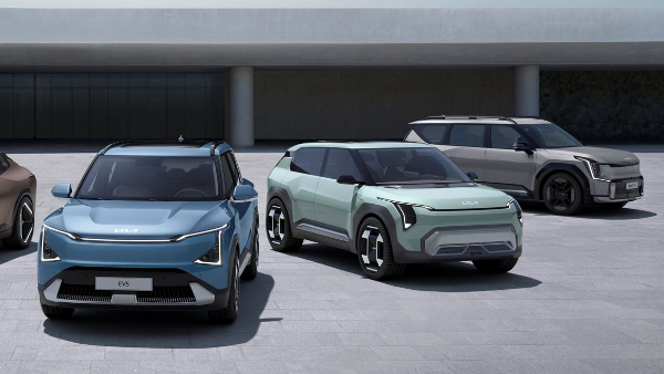 3대의 전기차의 디자인을 동시에 비교해 보면, 가장 오른쪽 EV9을 줄여놓은 것 같은 차량 디자인이 왼쪽에 있는 EV5 이죠!
