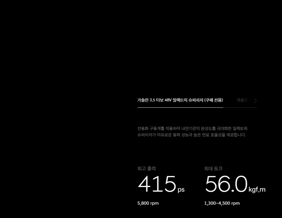 핵심은 48V 마일드 하이브리드가 적용된 슈퍼차저이죠? G90에서만 제공되었다가 GV80 쿠페에서만 선택할 수 있는 특화된 파워트레인이죠!