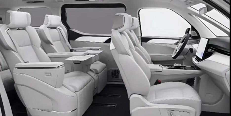 반면 EM90은 가로형 인포테인먼트가 제공됩니다. 사이즈는 15.4인치 노트북을 펼쳐놓은 것 같은 커다란 디스플레이가 제공됩니다. 실내 공간은 5미터가 넘는 미니밴 답게 정말 여유롭고 안락한 느낌의 시트를 볼 수 있는데 시트 헤드레스트에는 마치 스피커가 장착되어 있을 것 같은 디자인입니다.