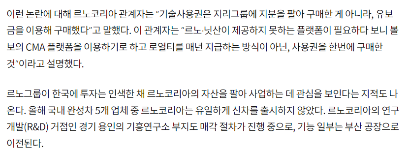 9월6일자 경향신문의 보도 자료를 인용하면, 르노코리아가 지리에게 넘긴 34%지분 2640억원은 신차 제작을 위한 기술사용권을 매입한 비용이라고 합니다.