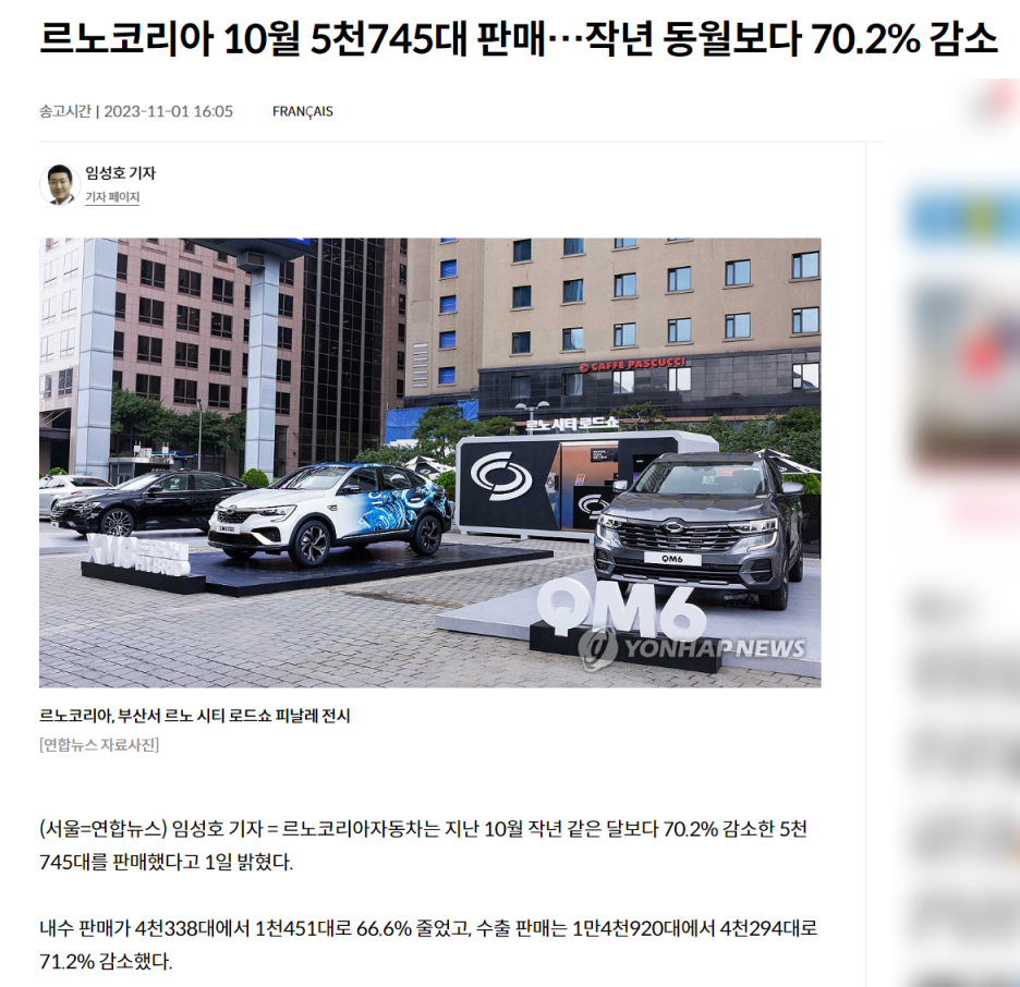올해 신차를 1대로 선보이지 못하고 있는 #르노코리아 의 부진이 이어지고 있다고 최근 알려드렸죠? 지난 10월에는 작년 동월대비 70% 감소한 5745대를 판매하면서 과연 국내에 있는 르노코리아자동차는 어떻게 될까? 이런 생각을 하는 가운데..