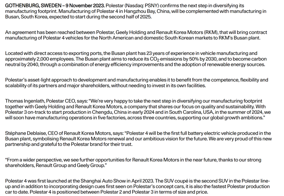 이렇게 된다면 부산 공장은 CMA 플랫폼을 활용한 차량을 제작하는 생산기지가 되며, 르노의 CMA 플랫폼 차량과 추후 지리자동차의 SEA 플랫폼 차량중에서 첫 번째로 폴스타4를 생산하게 됩니다.