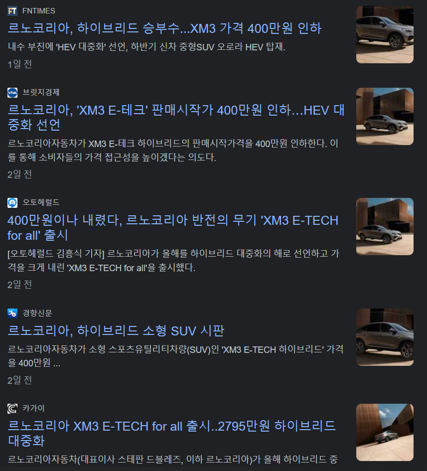 안녕하세요? 연못구름입니다. 르노코리아가 올해 시작과 함께 핵심 차량인 XM3 하이브리드의 가격을 한시적으로 약 400만원 인하했습니다.
