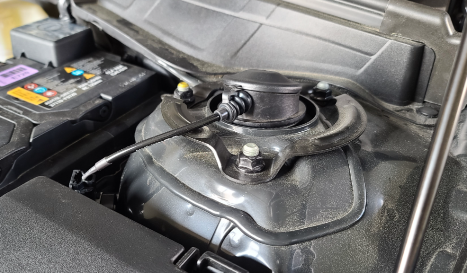 전자제어 서스펜션이 적용된 차량의 엔진룸을 열어보면 스트럿링 중앙 고무가 볼록 올라와 있으며, 신호를 보내기 위한 선으로 연결되어 있습니다.