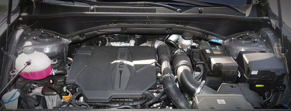 그럼 어떤 엔진일까요? 테스트 차량의 엔진은 2.5 가솔린 터보 혹스 2.2 디젤 차량으로 예상됩니다. 엔진과 베터리의 위치, 터보와 흡기구 냉각수 등이 싼타페와 쏘렌토 2.5 가솔린 터보 차량과 유사합니다.