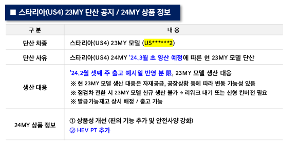 가장 궁금하신 점인 과연 언제 출시냐? 출시 일정도 확정했는데, 공문에 24.3월 초라고 정확하게 표기되어 있습니다. 앞으로 한달 뒤에는 스타리아 하이브리드 차량을 만나볼 수 있겠네요!