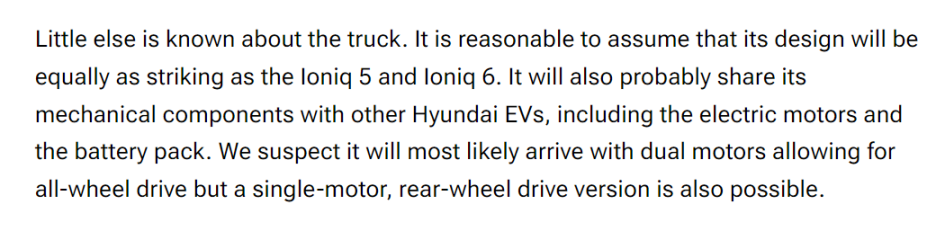 현재까지 아이오닉 T10에 대해서 알려진 정보는 거의 없지만, 디자인은 아이오닉5나 아이오닉6처럼 인상적이며, 최상위 픽업트럭인만큼 전륜과 후륜에 모터가 제공되는 4륜, 기본 후륜 모델은 점치는 분위기입니다.