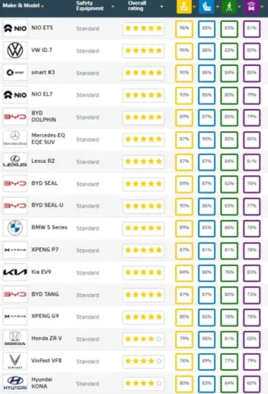 충돌 안전성은 최하위 아닌가요? 이런 반응도 그동안 많았는데.. 유럽 자동차 충돌 테스트 평가 기관의 자료를 보면 중국 브랜드가 최상위권을 차지하고 있으며, 폭스바겐2위 벤츠 EQE 6위로 겨우 자존심을 지키고 있습니다 .