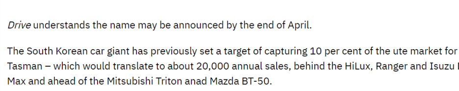 호주 시장에서 구체적인 판매 목표도 확인할 수 있는데 타스만은 ute 시장의 10%를 점유할 목표로 출시가 된다고 합니다.