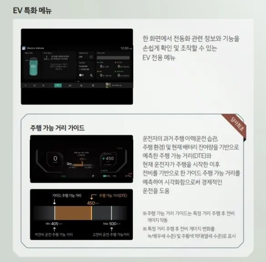 전기차만의 전용 콘텐츠가 제공되며, 여러분의 운전 습관을 학습해서 운행 가능한 예측 주행 거리 등이 표시가 됩니다. 시승하기 전까지 볼 수 없는 처음 보는 계기판 화면이죠!