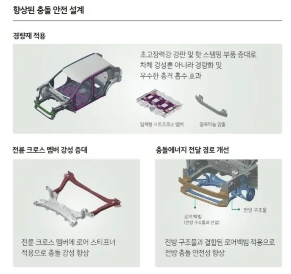 소형차에서 충돌 테스트 역시 중요한데 주요 부위에 초고장력 강판와 강성을 높인 것을 알 수 있습니다.