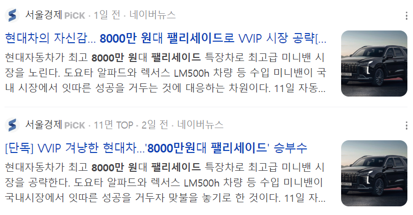판매량이 많은 차량들이 아닌데.. 이런 상황에서 신형 출시를 앞두고 8000만원대 팰리세이드로 VVIP를 공략한다는 기사가 올라왔습니다.