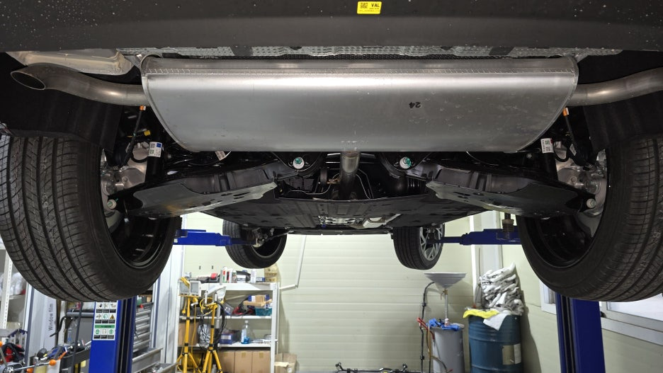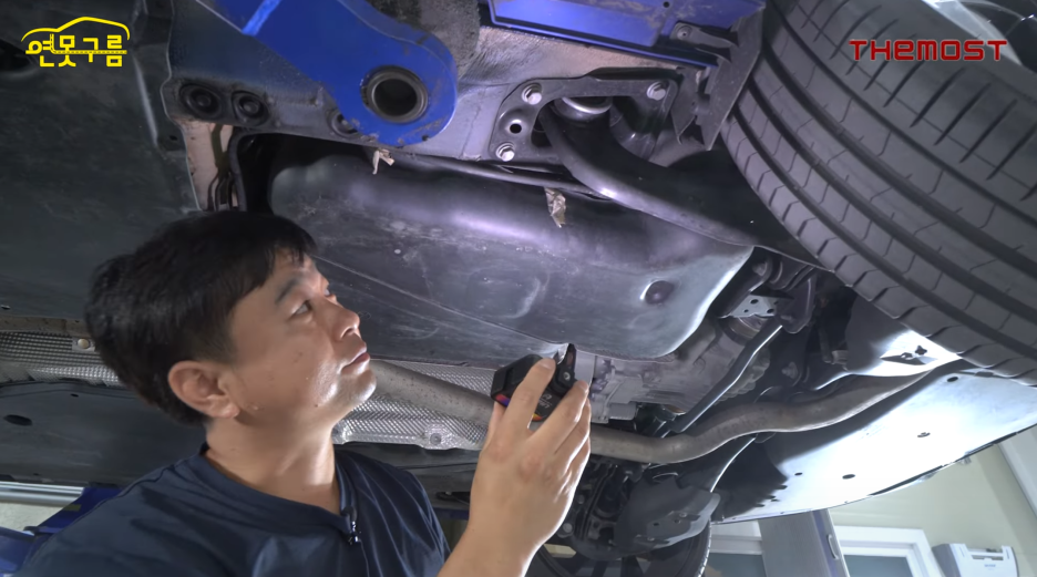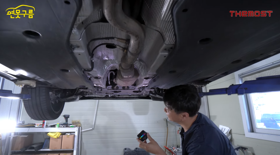 참고로 국내 중형급 차량의 하체입니다. 배기관이 지나는 상부를 보면 자체에 방열처리를 한 것이 아닌 배기관 상부에 작은 철판으로 방열처리했죠?