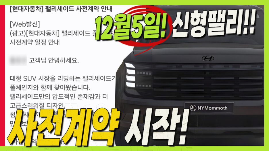 신형 팰리세이드의 사전 계약 일정은 금주 12월 5일 목요일로 확인이 되었고, 빠르게 운영하는 채널을 통해서 알려드렸습니다.