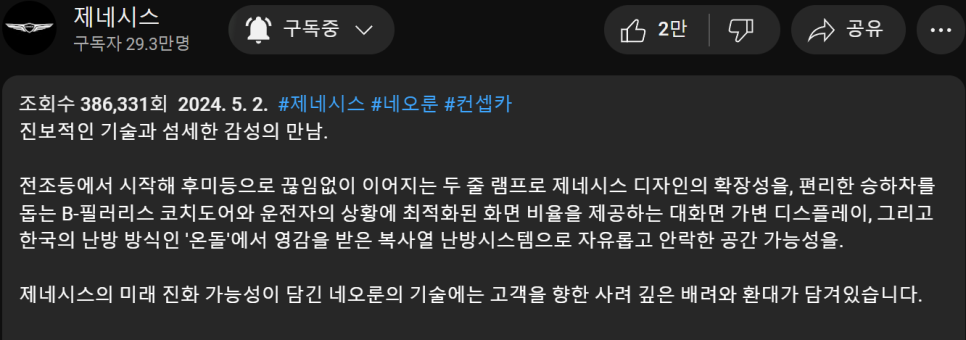 이런 기술이 양산화에 적용되는지 어떻게 알 수 있나요? 이렇게 물어보시는 분들이 계신데, 제네시스 공식 유튜브 채널에는 양산화에 힌트가 제공되죠?
