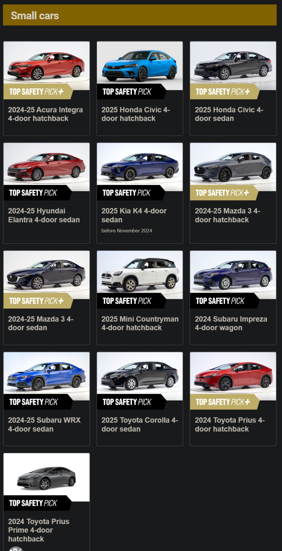 TOP SAFETY PICK+ 보다 아래인 TOP SAFETY PICK에는 현대 #엘란트라(아반떼)와 기아 #K4 가 포함되어 있습니다.