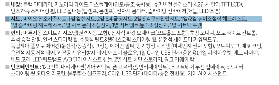 ■시트 : 운전석 파워시트, 1열 통풍시트, 운전석 전동식 허리지지대, 2열 열선시트, 2열 6:4 슬라이딩 연동 리클라이닝시트, 2열 센터 암레스트, 1열 시트백 하드 커버&듀얼 포켓 ■편의 : 하이패스 자동결제 시스템(e hi-pass 기능 포함), 컬럼 타입 전자식 변속 레버, 패들 쉬프트, 스마트폰 무선충전 시스템(듀얼), 레인센서, 2열 에어벤트, 1열 시트백 C타입 USB 단자(충전용), 사이드 스토리지