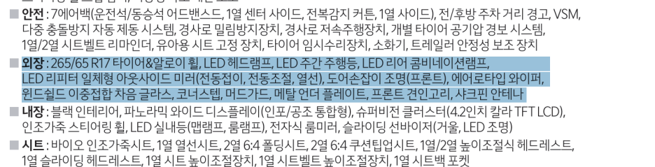 외장 사양을 보면 외장 : 265/65 R17 타이어&알로이 휠이 기본입니다.