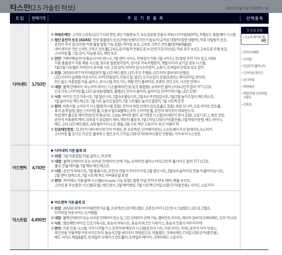 타스만 계약 시작! 트림별 차이점! 가성비와 패밀리 용도! 풀옵션 차이!